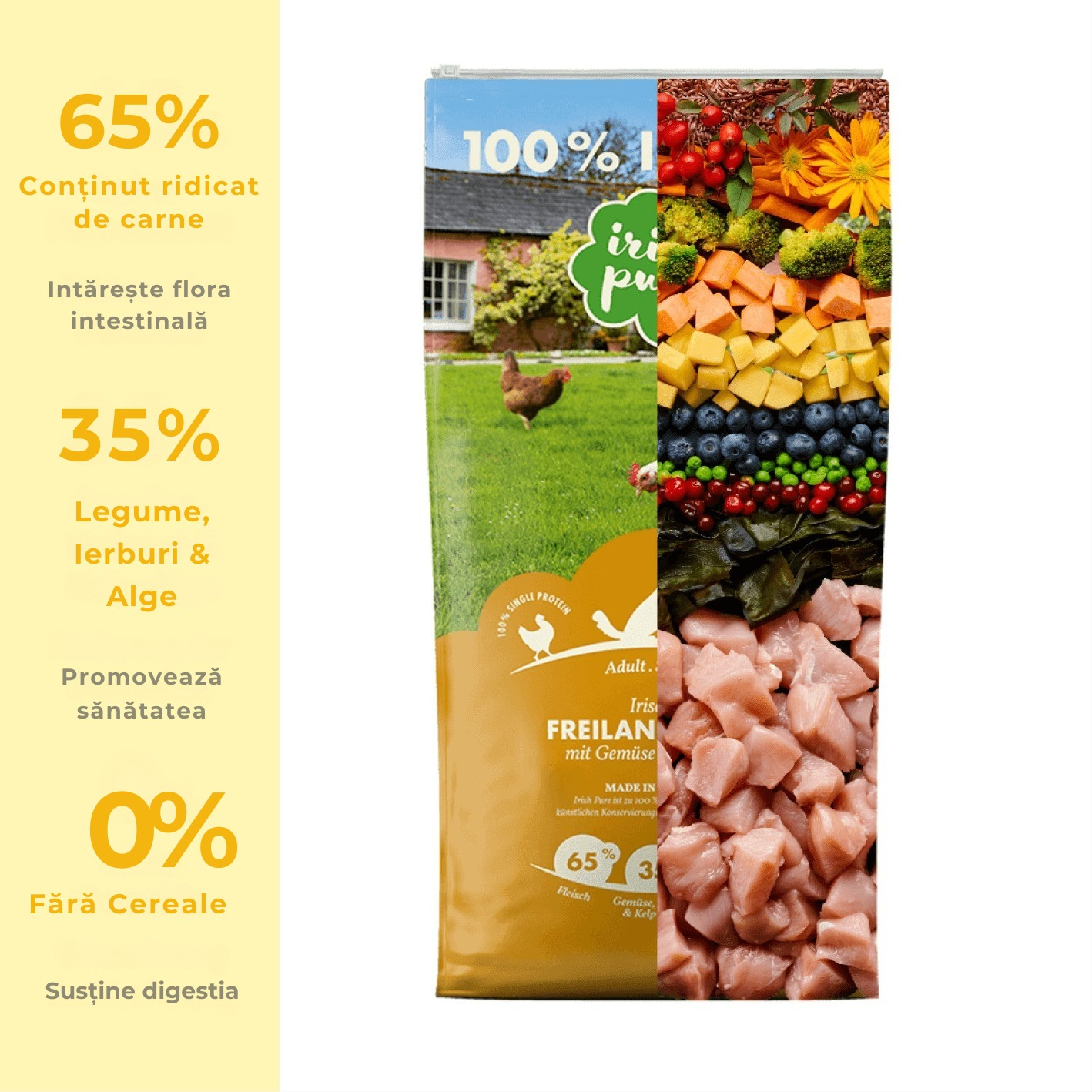 Carnea de 65% din pui irlandezi crescuti in aer liber continuta in acest aliment este o sursa excelenta si usor de digerat de proteine. Acest lucru permite stomacului cainelui sa se concentreze asupra digerarii singurei surse de proteine, care previne tulburarile gastro-intestinale. Este important pentru noi sa putem oferi hrana pentru caini naturala si fara cereale, care se bazeaza pe cresterea animalelor de pasune 100% adecvata speciei. In Irlanda, animalele stau afara 365 de zile pe an si respira aer curat si sarat. Aceasta crestere a animalelor adecvata speciei este foarte importanta pentru noi.
